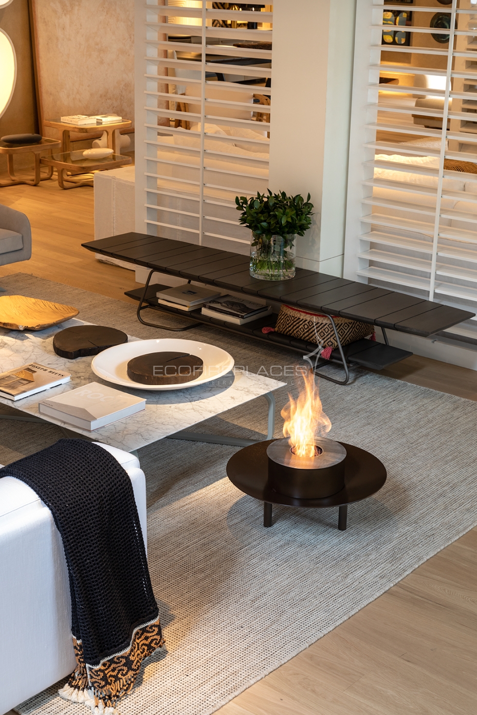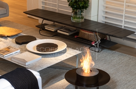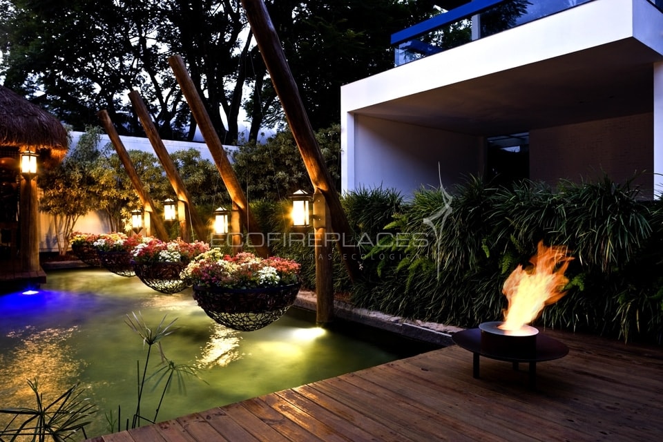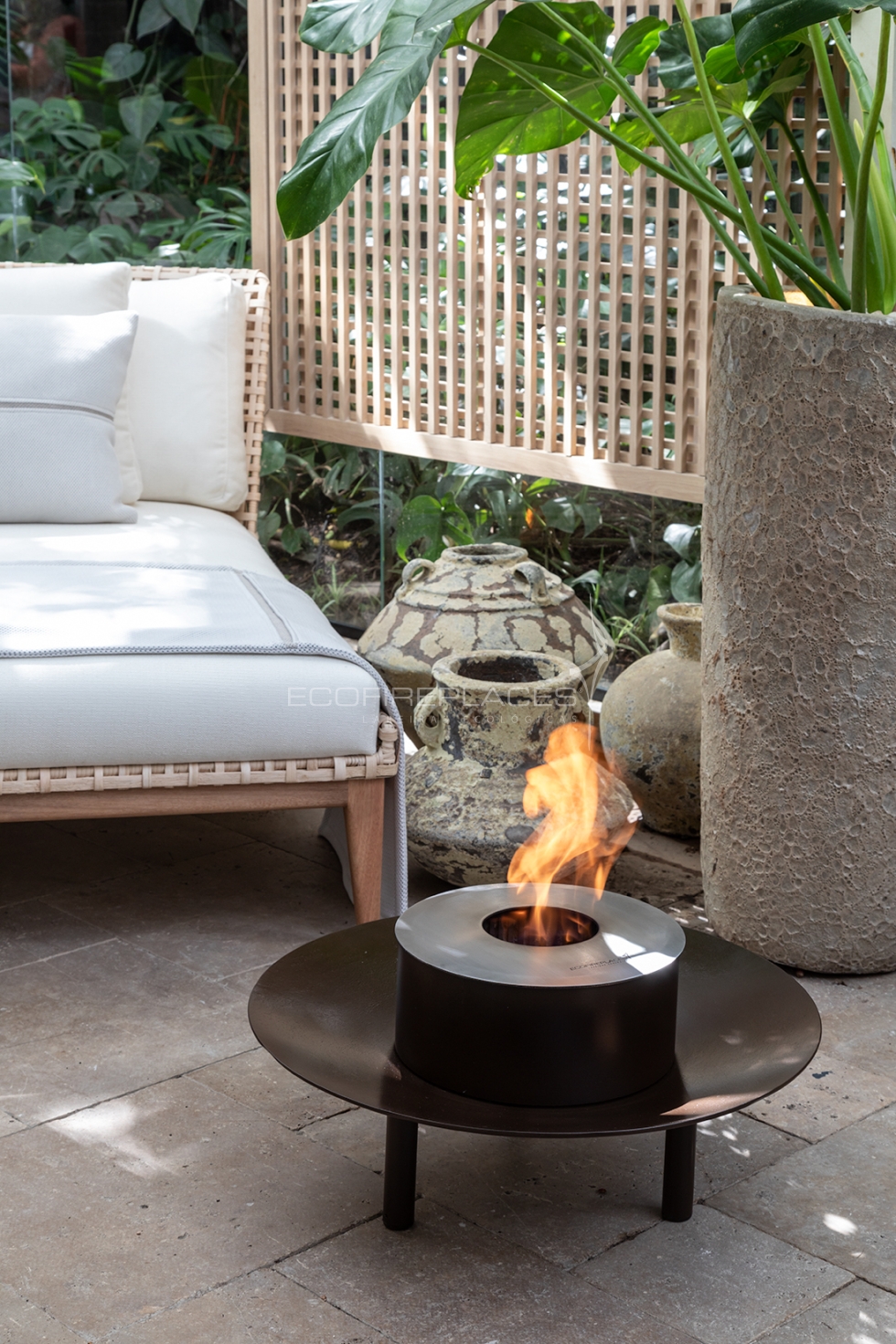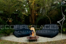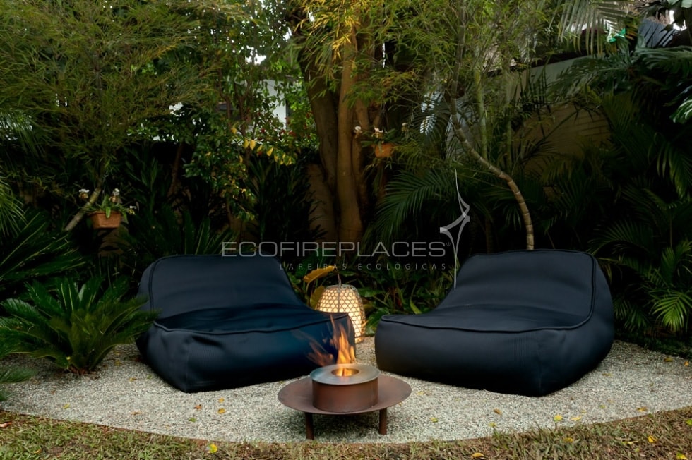 Lareira Ecológica Portátil Ecofireplaces com base em aço tipo corten e Queimador ECO 35 com capacidade de 5 litros de Biofluido. Tempo de queima em média 1 hora por litro, aquece uma área aproximada de 50 m² e pesa 15 kg. Com dimensões de Ø 60 x 26 cm. Kit com abafador, acendedor, funil e dosador.